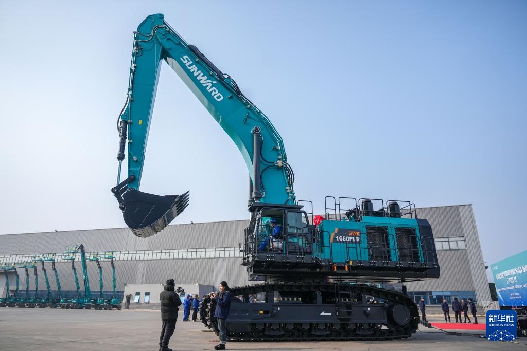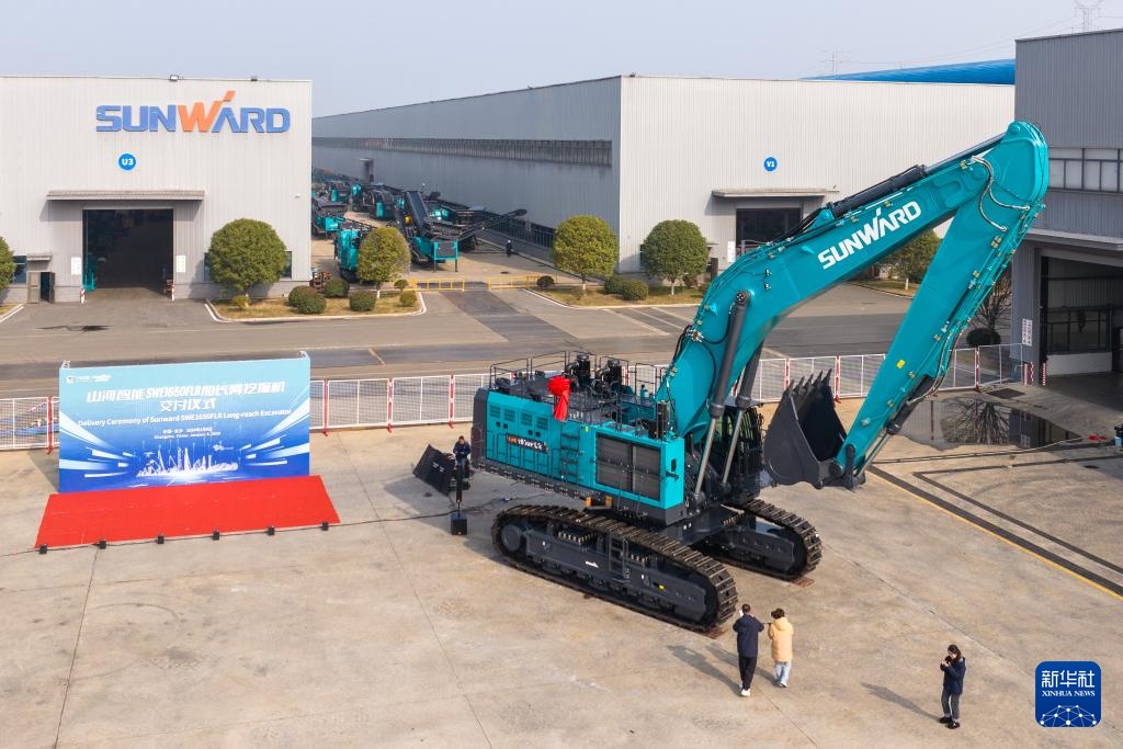 原标题:出口中东地区超大型加长臂发掘机在长沙下线日在长沙山河工业城拍照的山河智能SWE1650FLR加长臂发掘机。